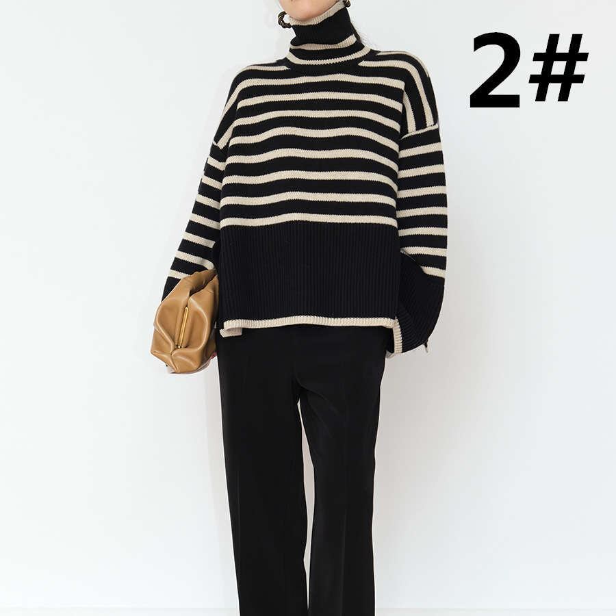 厚手ストライプ柄体型カバーハイネックニットセーター