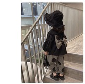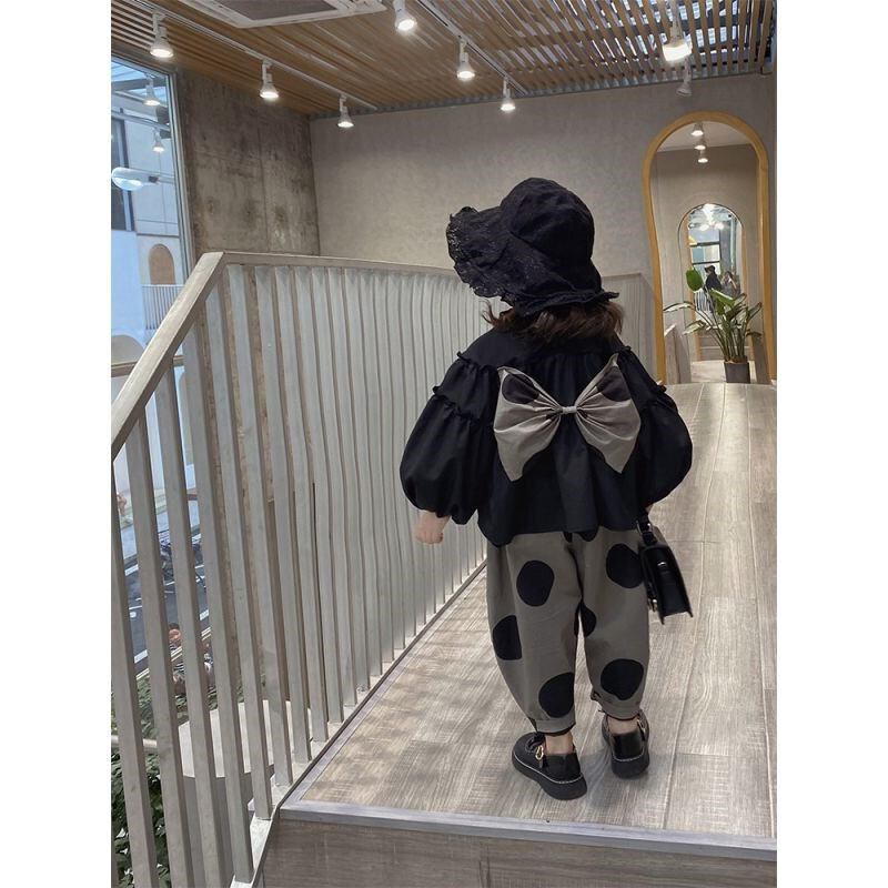 かわいらしいドット柄のブラウスシャツとワイドパンツのセットです。子供たちが着ると一気におしゃれに見えるアイテムです。