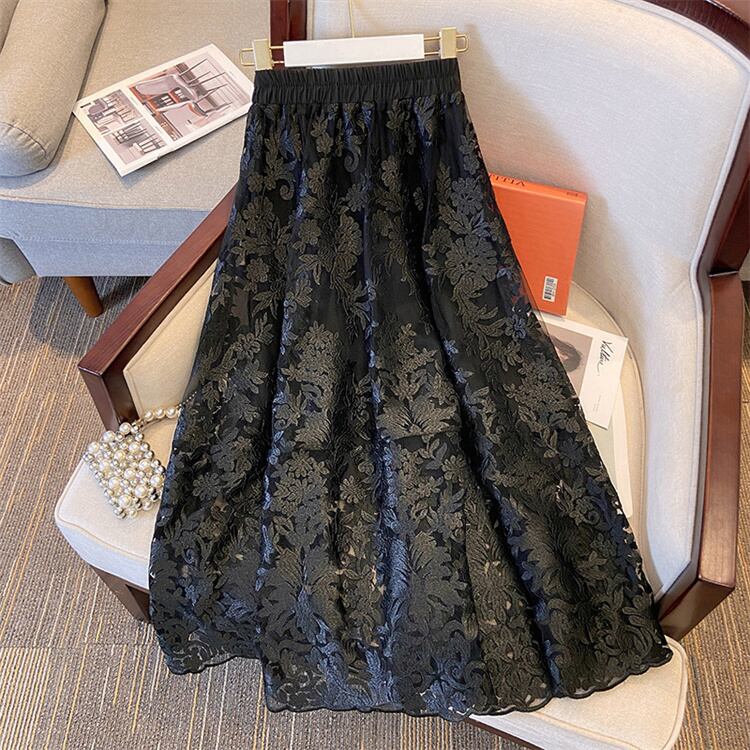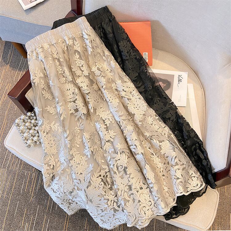 レトロな中丈ハーフスカート、その名の通り、ヴィンテージな雰囲気漂う一枚です。上品な刺繍が施されており、どこかノスタルジックな雰囲気を醸し出しています。膝丈のフレアスカートは、立体感のあるシルエットが女性らしさを引き立ててくれます。