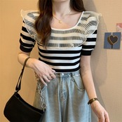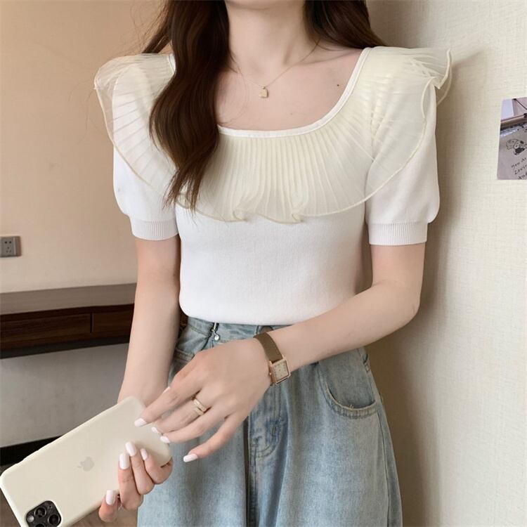 華やかなフリルがポイントのニットトップス。半袖なので春夏にぴったりのアイテムです。女性らしいシルエットと遊び心あふれるデザインで、コーディネートのアクセントにぴったり。程よい肌見せが涼しく、トレンド感たっぷり。